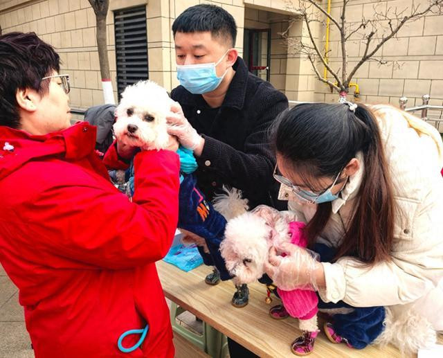 (图为市场上宠物病院伙计在照拂“毛孩子”)